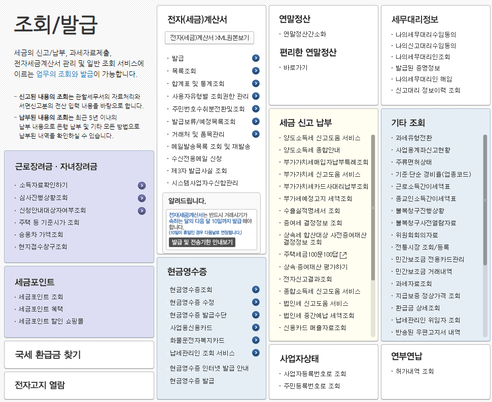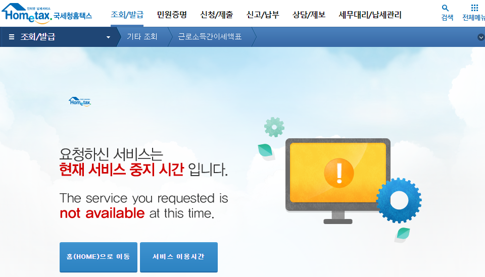 전자신고, 전자납부, 민원증명, 신청 제출, 조회/발급 등 서비스 종류마다 운영시간이 다르니 확인 후 이용하시기바랍니다.