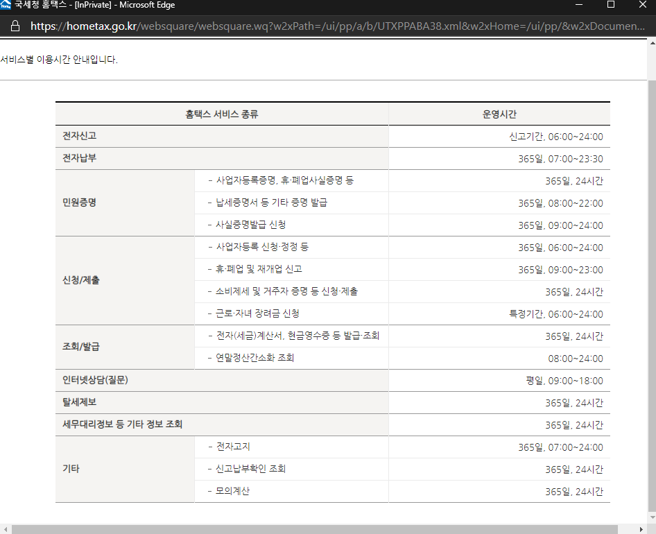 국세청 홈택스의 운영시간입니다.