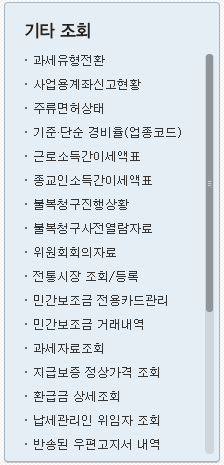 기타 조회를 보시면 과세 유형 전환, 사업용 계좌신고현황, 주류면허상태, 기준 단순 경비율이 있고 다섯번째에 근로소득 간이세액표가 있습니다.