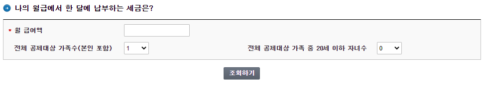 월 급여액, 전체 공제대상 가족수, 전체 공제대상 가족 중 20세 이하 자녀수를 입력 한 후 조회를 하면 한달에 납부하는 세금을 확인하실 수 있습니다.