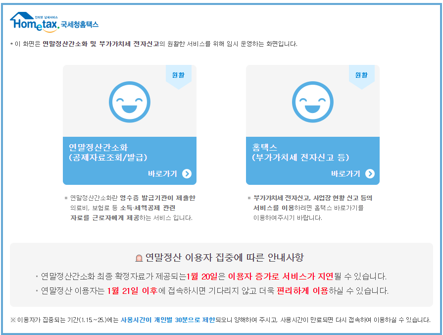 원래라면 국세청 홈택스에 접속하면 다른 화면이 나오지만 현재 연말정산 기간이라서 위 화면이 먼저 나오게 됩니다.