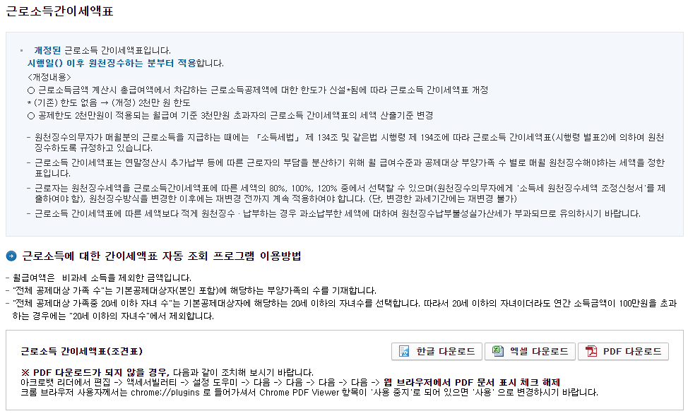 그리고 화면 아래로 내려가면 근로소득에 대한 간이세액표 자동 조회 프로그램이 있습니다.