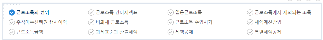 근로소득의 범위, 근로소득 간이세액표, 일용근로소득, 근로소득에서 제외되는 소득, 비과세 근로소득 등 다양한 내용을 확인하실 수 있으니 조금더 디테일한 내용을 원하시면 홈페이지에 접속하시기 바랍니다.