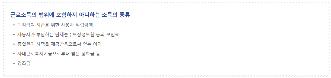 그리고 퇴직급여 지급을 위한 사용자 적립금액, 사용자가 부담하는 단체순수보장성보험 등의 보험료, 종업원이 사택을 제공받음으로써 얻는 이익, 사내근로복지기금으로부터 받는 장학금 등, 경조금은 근로소득에 포함되지 않습니다.