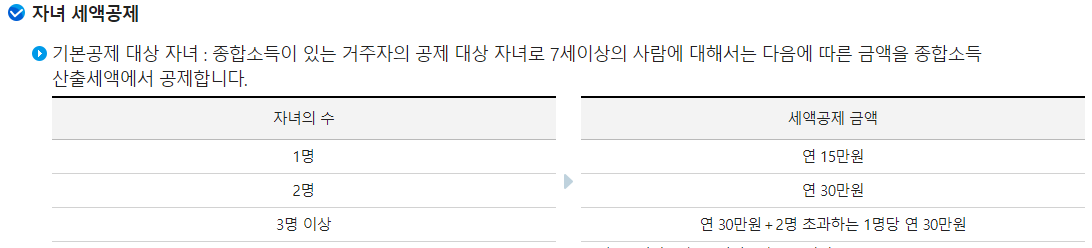 다음은 자녀 세액공제입니다 자녀의 수가 1명이면 연 15만원이 공제되고 2명이면 연 30만원, 3명이상이면 연 30만원 + 2명초과하는 1명당 연 30만원 공제가 됩니다.