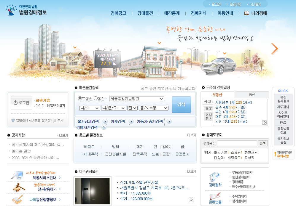 홈페이지에 접속하시면 경매공고, 경매물건 등의 메뉴가 보이고 중앙에는 빠른 물건검색이 보입니다.