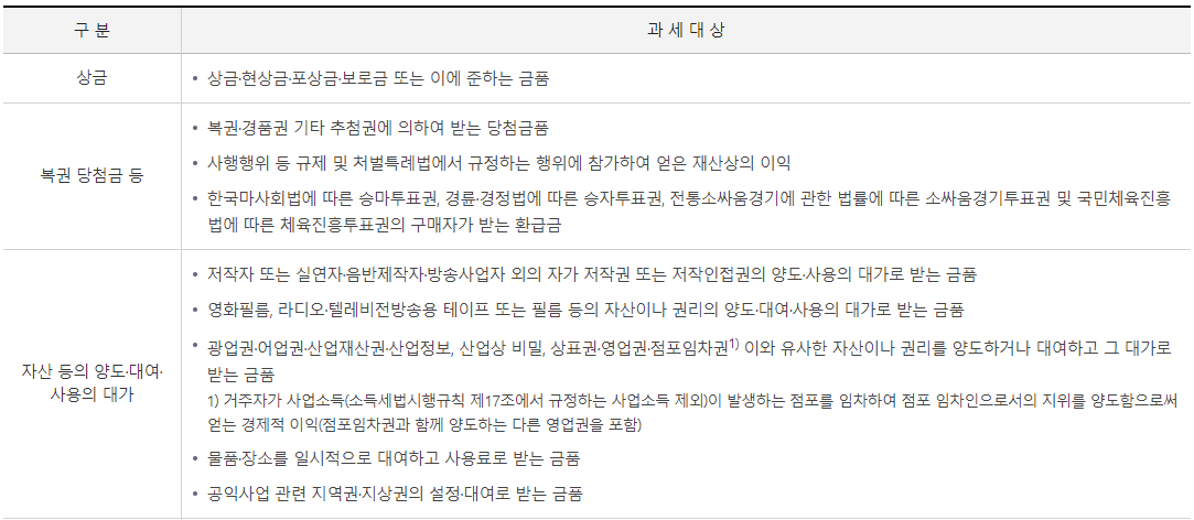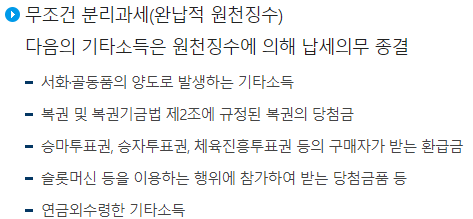 서화·골동품의 양도로 발생하는 기타소득, 복권 및 복권기금법 제2조에 규정된 복권의 당첨금, 승마투표권, 승자투표권, 체육진흥투표권 등의 구매자가 받는 환급금, 슬롯머신 등을 이용하는 행위에 참가하여 받는 당첨금품 등, 연금외수령한 기타소득은 원천징수에 의해 납세의무가 종결되어 무조건 분리과세가 됩니다.