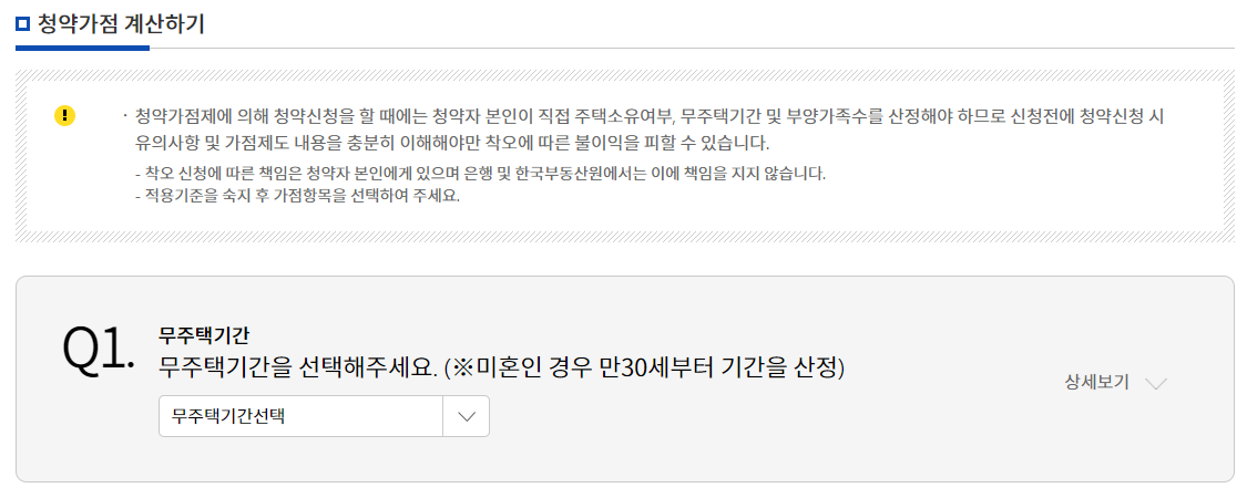 청약가점계산기를 클릭하면 무주택기간을 선택하는 칸이 보이실텐데 여기서 오른쪽에 보이는 상세보기를 클릭하시기 바랍니다.