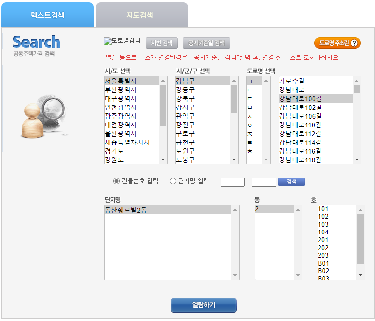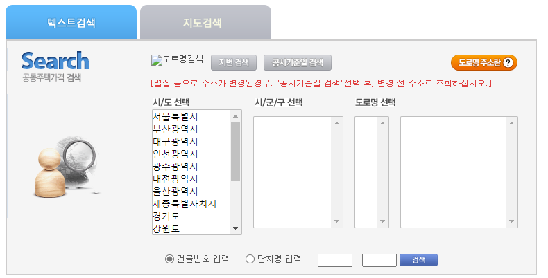 텍스트 검색은 먼저 시/도를 선택하고, 시/군/구를 선택하고, 도로명을 선택 후 단지 아파트를 선택하시면 됩니다.