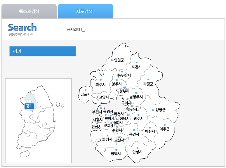 보시면 텍스트 검색, 지도 검색이 보이는데 먼저 텍스트 검색을 통해서 공동주택 공시가격열람을 해보도록 하겠습니다.