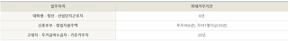 마지막으로 고령자, 주거급여수급자, 기존주거자는 최대거주기간이 20년입니다.