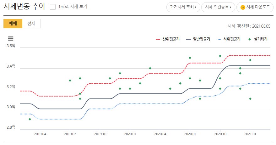 39.58/30.3 공급/전용(㎡) 기준으로 실거래가가 2021년 1월에는 3억 5천 정도로 확인이 됩니다.