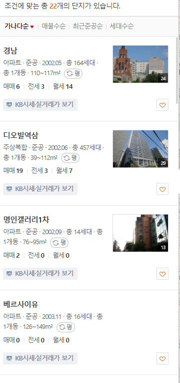 왼쪽을 보시면 여러가지 아파트, 오피스텔들이 보이실텐데 찾고 있던 곳이 있다면 바로 클릭하셔서 kb시세 실거래가 보기를 클릭하셔서 시세를 보시면 됩니다.
