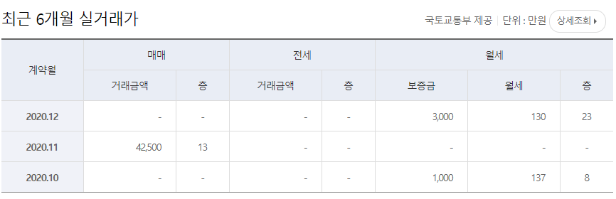2020년 11월 기준으로 매매가가 42,500만원으로 13층이 거래된 흔적이 보이며 월세는 2020년 12월 보증금 3천만원에월세 130만원 층수는 23층, 2020년 10월 기준으로 보증금 천만원, 월세 137만원으로 8층이 거래된 흔적이 보입니다.