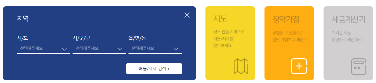 홈페이지에 접속하시면 지역, 지도, 청약가점, 세금계산기 등의 메뉴가 보이실텐데 여기서 전국 아파트 시세조회를 하려면 아래쪽에 보이는 지역 또는 지도 메뉴를 이용하시면 됩니다.