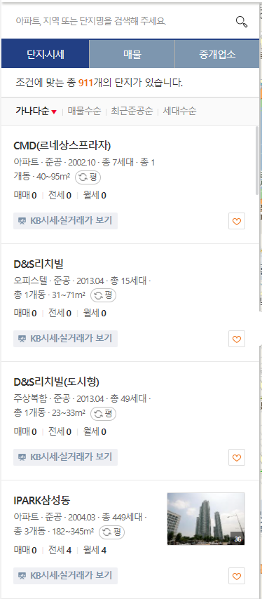 만약에 바로 찾고 있는 아파트가 보이지 않는다면 위 검색창에 찾고 있는 아파트의 단지명을 입력하시면 됩니다.
