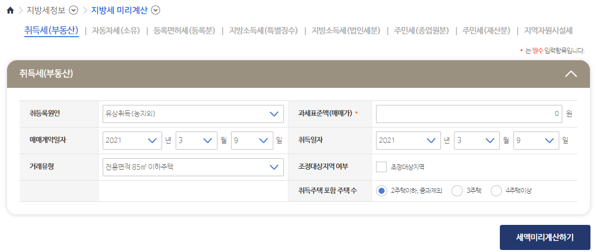 부동산 취득세 계산기를 이용하시려면 지방세 미리계산을 클릭하시기 바랍니다.