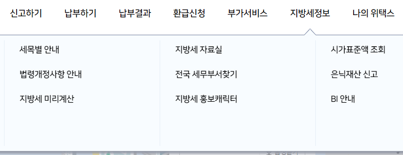 많은 메뉴들 지방세 정보에 마우스 커서를 올려보시면 서브 메뉴들이 아래쪽에 나오는데 왼쪽 아래를 보시면 지방세 미리계산이 보입니다.