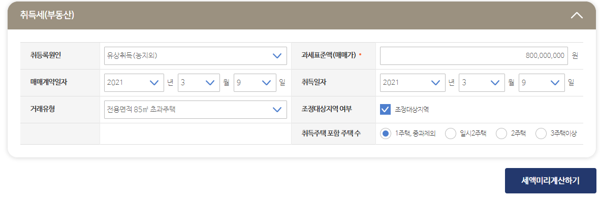 취등록 원인은 유상취득(농지외), 매매계약일자는 3월 9일, 취득일자도 2021년 3월 9일, 과세표준액은 8억, 전용면적은 85제곱미터 초과, 조정대상지역, 취득주택 포함 주택수는 1주택,종과제외를 선택 후 세액 미리계산하기를 클릭해보았습니다.