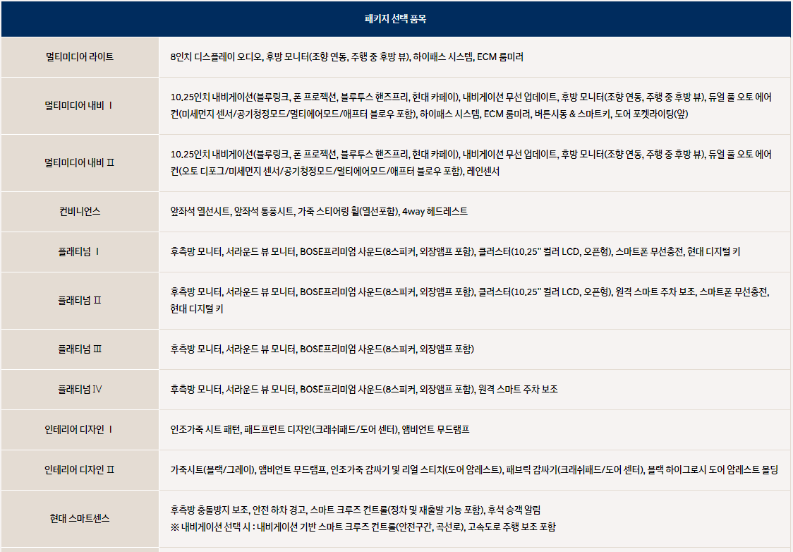 멀티미디어 내비 Ⅱ의 경우 10.25인치 내비게이션(블루링크, 폰 프로젝션, 블루투스 핸즈프리, 현대 카페이), 내비게이션 무선 업데이트, 후방 모니터(조향 연동, 주행 중 후방 뷰), 듀얼 풀 오토 에어컨(오토 디포그/미세먼지 센서/공기청정모드/멀티에어모드/애프터 블로우 포함), 레인센서가 선택됩니다.
