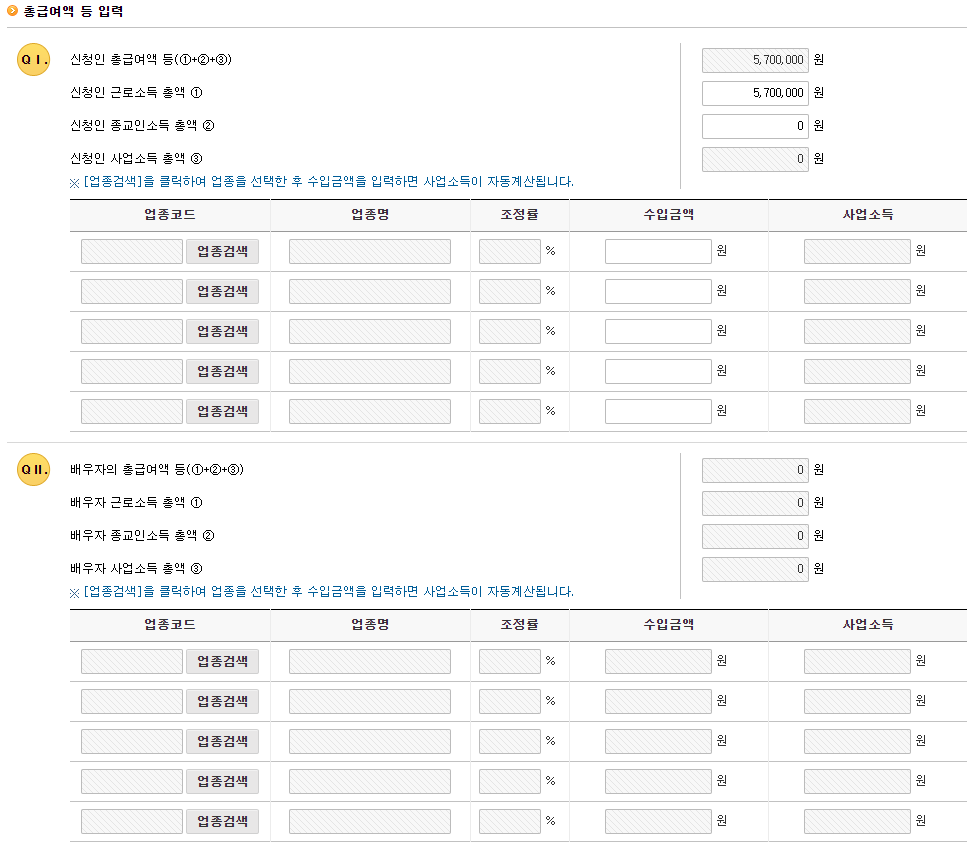 클릭하시면 배우자 부양자녀의 여부, 총소득, 재산 등을 선택할 수 있는 화면으로 이동됩니다.