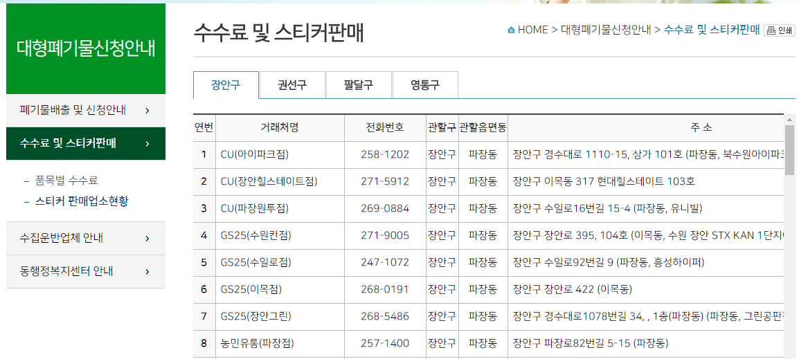 폐기물 스티커 판매업체를 클릭하시면 장안구, 권선구, 팔달구, 영통구 별로 판매하는 업소현황을 보실 수 있고 왼쪽에 품목별 수수료를 클릭하시면 품목별로 스티커의 가격을 확인하실 수 있습니다.