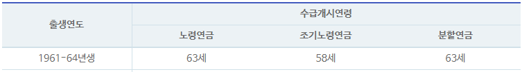 1953~56년생은 국민연금 수령나이가 61세이며 조기노령연금과 분할연금도 1살이 증가한 56세입니다.