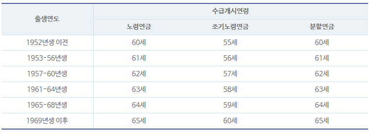 1965~68년생은 노령연금이 64세, 조기노령연금이 59세, 분할연금이 64세이며, 1969년생 이후는 노령연금이 65세, 조기노령연금이 60세, 분할연금이 65세입니다.