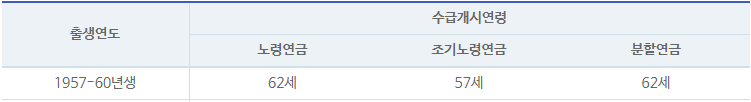 다음은 1957~60년생의 국민연금 수령나이입니다.