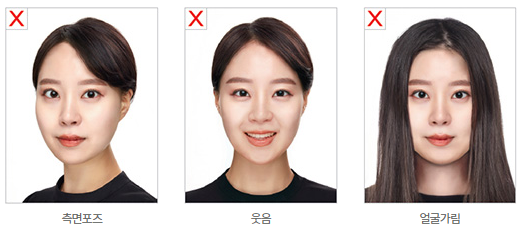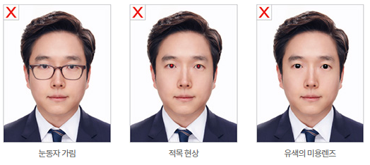 그리고 눈은 옆을 보거나 하면 안되기 때문에 정면을 응시하여야 하며 눈이 안경테에 의하여 가려지거나 유색의 미용렌즈 등을 사용 할 수 없고 렌즈에 빛이 반사되지 않은 사진이어야 합니다.