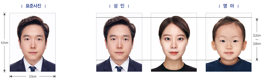 여권사진 규정 사이즈는 가로 3.5cm, 세로 4.5cm인 천연색 상반신 정면 사진이어야 하며 머리길이(정수리부터 턱까지)는 3.2 ~ 3.6cm 이어야 합니다.