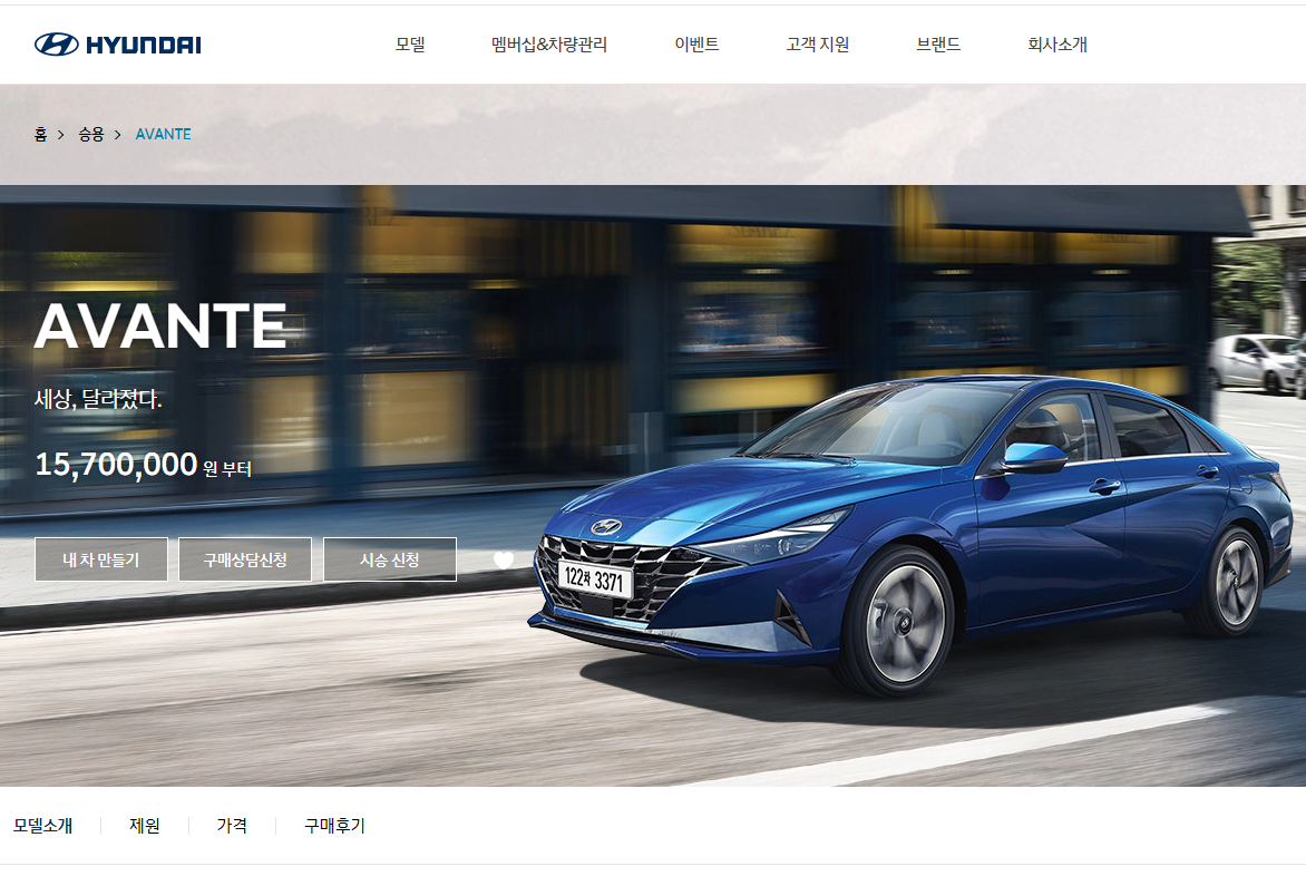 아반떼를 클릭하시면 아반떼의 정보를 확인할 수 있는 페이지로 이동이 됩니다.