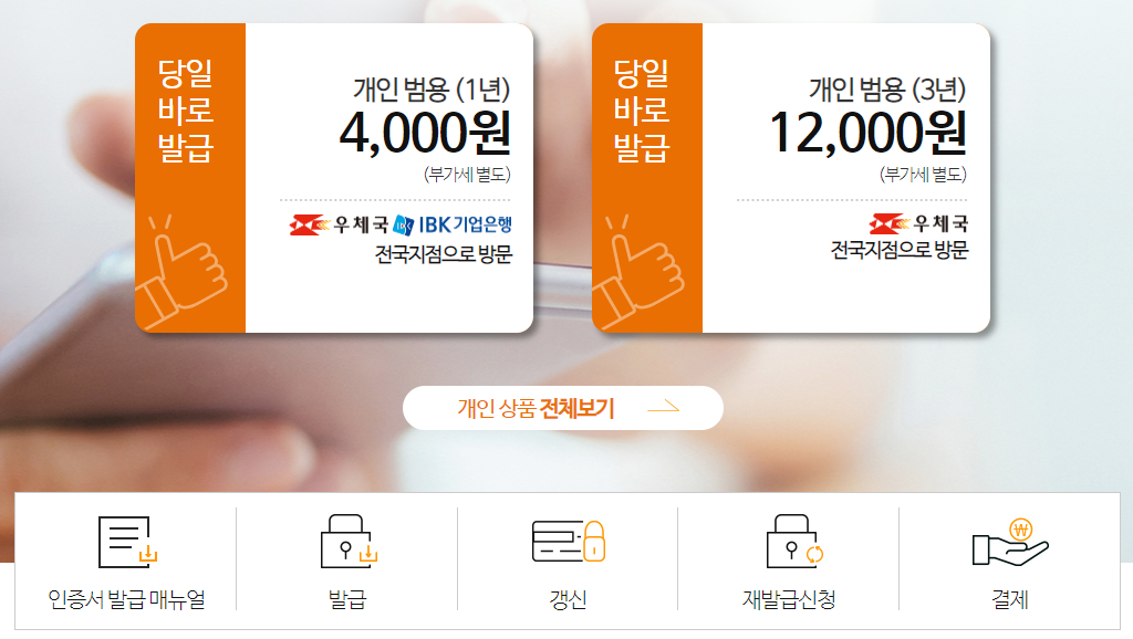 한국정보인증 홈페이지에 접속하시면 위 메뉴들이 나오게 될텐데 여기서 중앙 왼쪽편에 있는 공동인증서 개인을 클릭하시면 됩니다.