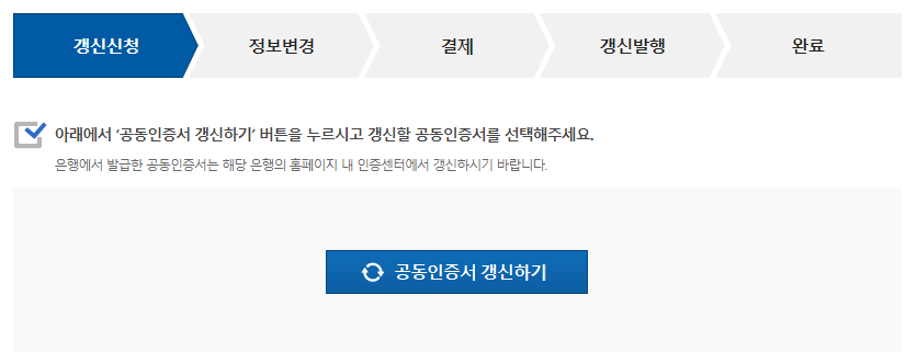 한국정보인증 공인인증서 갱신 절차는 갱신 신청 -> 정보변경 -> 결제 -> 갱신 발행 -> 완료입니다.