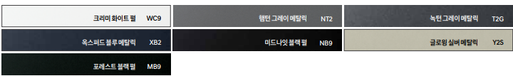 그랜저 색상은 크리미 화이트 펄 WC9, 햄턴 그레이 메탈릭 NT2, 녹턴 그레이 메탈릭 T2G, 옥스퍼드 블루 메탈릭 XB2, 미드나잇 블랙 펄 NB9, 포레스트 블랙 펄 MB9, 글로윙 실버 메탈릭 Y2S 가 있고 글로윙 실버메탈릭은 캘리그래피 트림만 선택할 수 있습니다.