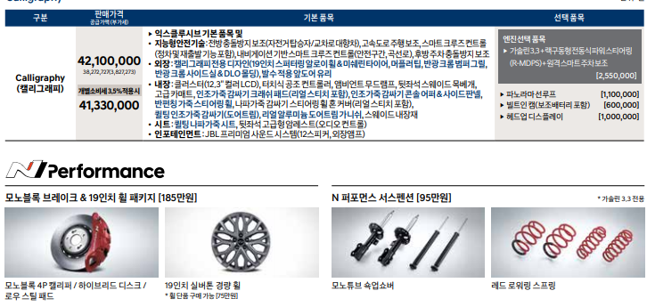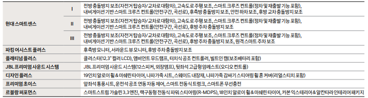 기본품목은 위 표를 살펴보시기 바라며 파노라마 선루프, 헤드업 디스플레이, 가솔린 3.3 + 랙구동형전동식파워스티어링, 18인치 알로이 휠&미쉐린타이어, 현대 스마트 센스, 파킹 어시스트 플러스, 플래티넘 플러스, 프리미엄 초이스를 선택하실 수 있습니다.
