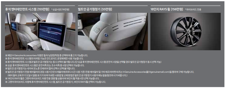 후석엔터테인먼트 시스템, 빌트인 공기 청정기, 18인치 RAYS 휠이 있는데 가격은 각각 155만원, 55만원, 156만원입니다.