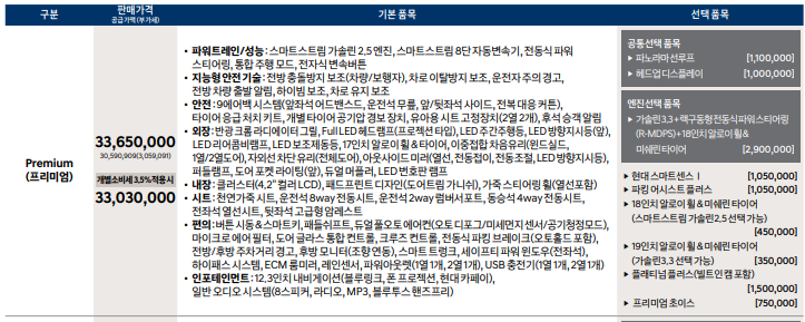 프리미엄 등급은 가격이 33,650,000원, 개별소비세 35%적용 시 33,030,000원이빈다.