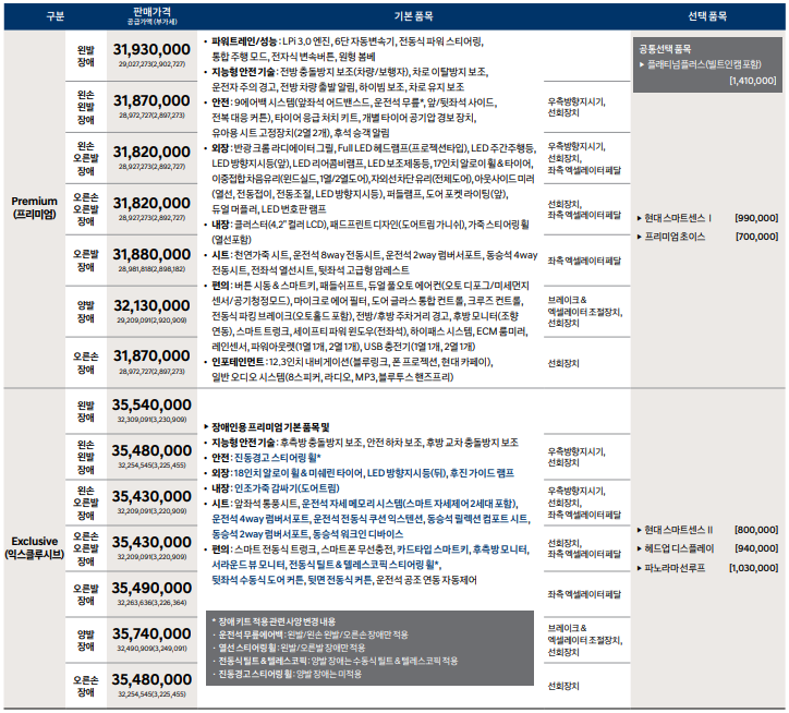 프리미엄 기준으로 왼발 장애은 31,930,000원, 오른발 장애는 31,880,000원, 익스클루시브 기준으로 왼발 장애는 35,540,000원, 오른ㄹ발 장애는 35,490,000원입니다.