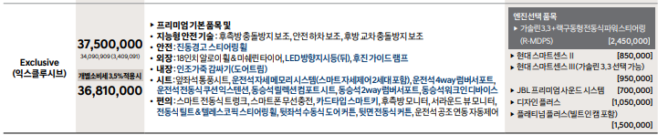 그리고 익스클루시브에서는 가솔린 3.3 랙 구동형 전동식 파워 스티어링, 현대 스마트 센스, JBL 프리미엄 사운드 시스템, 플래티넘 플러스를 선택하실 수 있습니다.