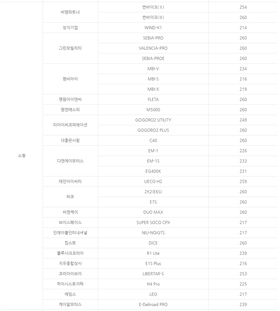 마지막으로 전기 이륜차 보조금입니다. 전기 이륜차도 경형, 소형, 대형 등으로 나뉘는데 보조금 표를 자세히 읽어보시기 바랍니다.