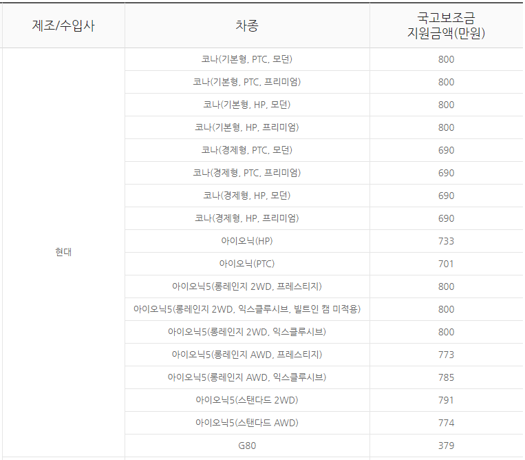 현대 자동차 승용차 중에서는 코나, 아이오닉5, G80이 보조금을 받을 수 있는데 코나(기본형, PTC, 모던) 800만원 , 코나(기본형, PTC, 프리미엄) 800만원 코나(기본형, HP, 모던) 800만원, 코나(기본형, HP, 프리미엄) 800만원 코나(경제형, PTC, 모던) 690만원 코나(경제형, PTC, 프리미엄) 690만원 코나(경제형, HP, 모던) 690만원 코나(경제형, HP, 프리미엄) 690만원입니다.