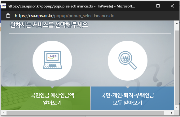 예상 연금액 조회를 클릭하시면 원하시는 서비스를 선택하라는 창이 나옵니다.