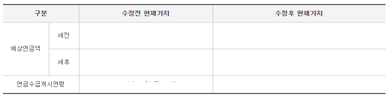 위 표 처럼 현재 가치 예상연금액, 미래가치 예상연금액, 수급 개시 년월, 예상 총 납부 월스, 예상납부총액을 확인하실 수 있습니다.