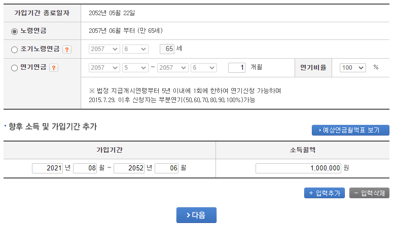 맨 아래쪽을 보시면 향후 소득 및 가입기간을 추가 하실 수 있는데 현재 소득보다 소득이 증가한다는 가정하에 입력을 하시면 아까 처음에 국민연금 예상수령액 보다 상승한 것을 확인하실 수 있을 것입니다.