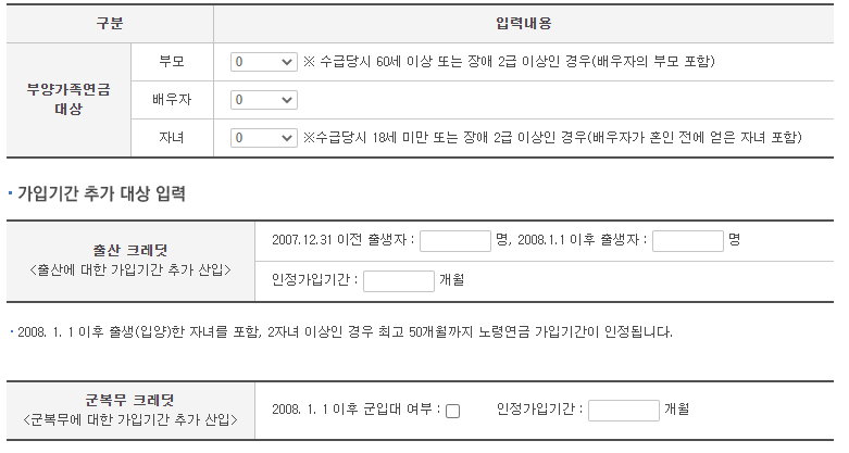 클릭하시면 가입기간 추가대상, 부양가족연금 대상, 군복무 여부, 출산 여부등을 선택하게 됩니다.
