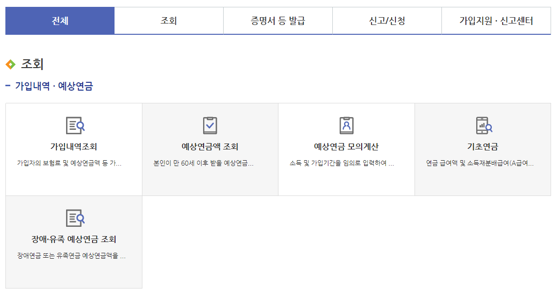 개인 서비스 메뉴에는 조회, 증명서 등 발급, 신고/ 신청, 가입 지원 신고센터, 민원 처리과정 조회가 있는데 여기서 국민연금 수력액을 확인하려면 조회를 클릭하여야 합니다.