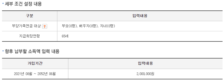 위 표 처럼 현재 가치 예상연금액, 미래가치 예상연금액, 수급 개시 년월, 예상 총 납부 월스, 예상납부총액을 확인하실 수 있습니다.