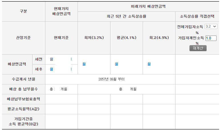 일부러 가려놓았는데 예를들어 현재기준 예상연금액이 60만원이라면 소득상승률이 반영되어 최저 3.2%를 기준으로 했을때 190만원 정도가 될것으로 생각됩니다.