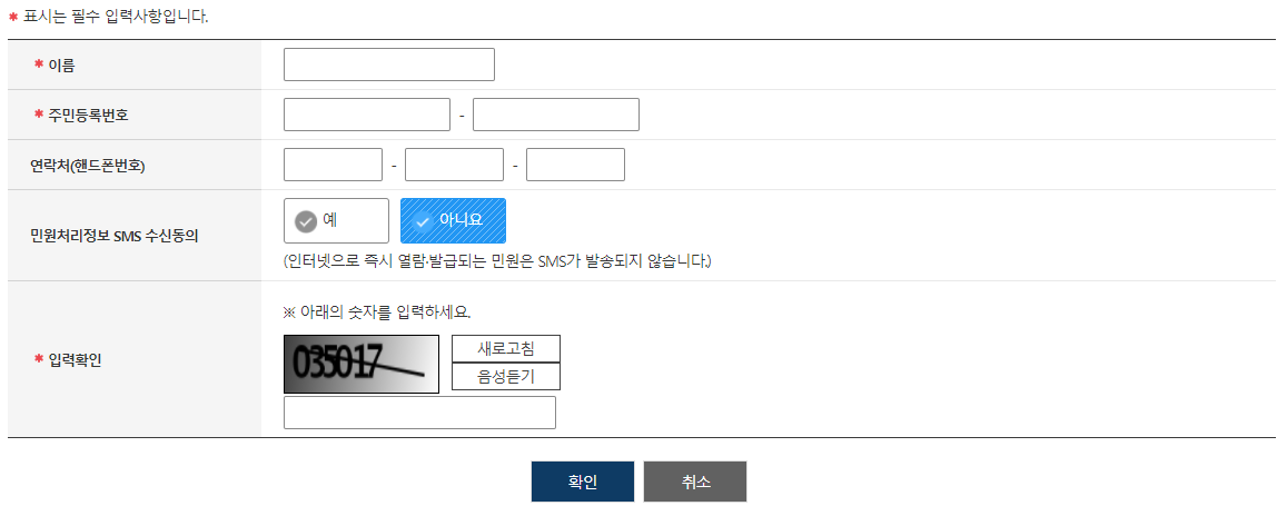 비회원 신청하기 기준으로 약관에 동의를 한후 이름, 주민등록번호를 입력하셔서 확인 버튼을 클릭하여야합니다.